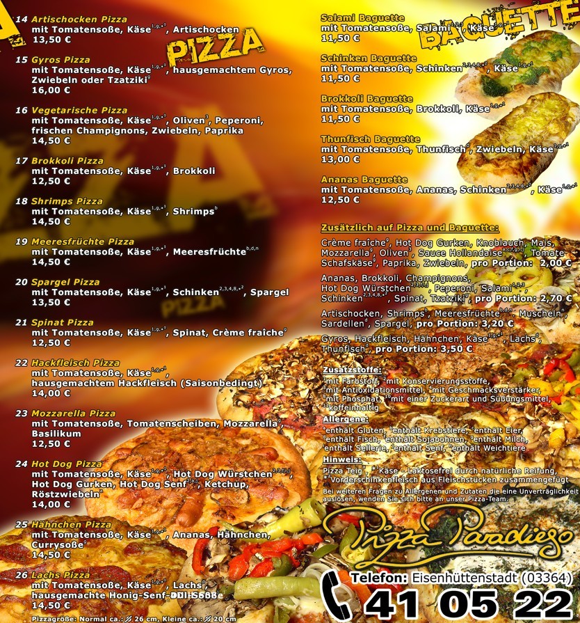 Pizza Paradieso, "Echte Steinofen Pizza", Saarlouiser Strasse 27, 15890 Eisenhüttenstadt, Telefon: (03364) 41 05 22