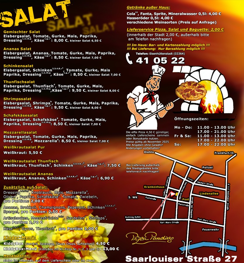 Pizza Paradieso, "Echte Steinofen Pizza", Saarlouiser Strasse 27, 15890 Eisenhüttenstadt, Telefon: (03364) 41 05 22